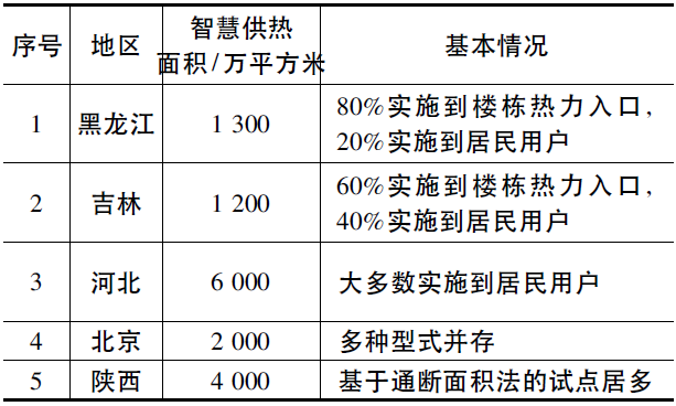 目前,國(guó)內(nèi)部分省、市在供熱系統(tǒng)的部分環(huán)節(jié)中進(jìn)行了智慧供熱系統(tǒng)的建設(shè)和嘗試。其中黑龍江和吉林省的智慧供熱主要采取實(shí)施到樓棟熱力入口的技術(shù)路線,也進(jìn)行了部分實(shí)施到居民用戶的嘗試;河北省以實(shí)施到居民用戶為主;陜西的試點(diǎn)以基于通斷面積法的方式為主,北京的試點(diǎn)采用多種型式,詳見(jiàn)表1。