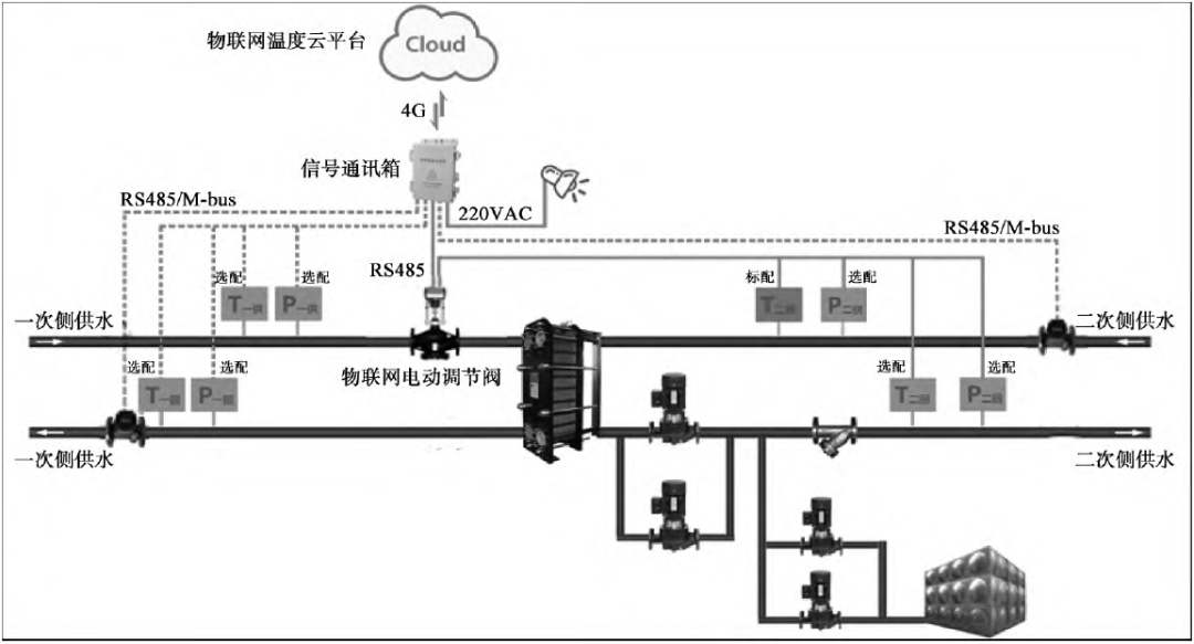 在換熱站一級(jí)網(wǎng)供水側(cè)配置物聯(lián)網(wǎng)電動(dòng)調(diào)節(jié)閥,一級(jí)網(wǎng)回水、二級(jí)網(wǎng)供水側(cè)配置物聯(lián)網(wǎng)超聲熱量表,同時(shí)在廠站動(dòng)力系統(tǒng)配置物聯(lián)網(wǎng)循環(huán)水泵及數(shù)據(jù)采集箱,將數(shù)據(jù)通過(guò)5G通訊傳送至云平臺(tái),在實(shí)現(xiàn)對(duì)供熱系統(tǒng)參數(shù)的實(shí)時(shí)監(jiān)控和調(diào)節(jié)的同時(shí),實(shí)現(xiàn)源—網(wǎng)—站的優(yōu)化調(diào)度和大數(shù)據(jù)分析。詳見(jiàn)圖2。