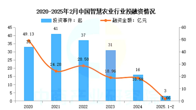 近年來,中國智慧農業(yè)行業(yè)投資事件數量及規(guī)模整體呈波動上升趨勢。IT桔子數據顯示,2024年我國智慧農業(yè)投資數量16起,已披露融資金額達18.59億元。2025年1-2月我國智慧農業(yè)投資數量3起,已披露融資金額達1.66億元。